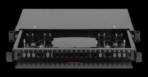 Оптический кросс NIKOMAX 19", 1U, до 24 SC портов или 48 LC портов, выдвижной, с полкой, черный, в комплекте: сплайс-кассета и КДЗС